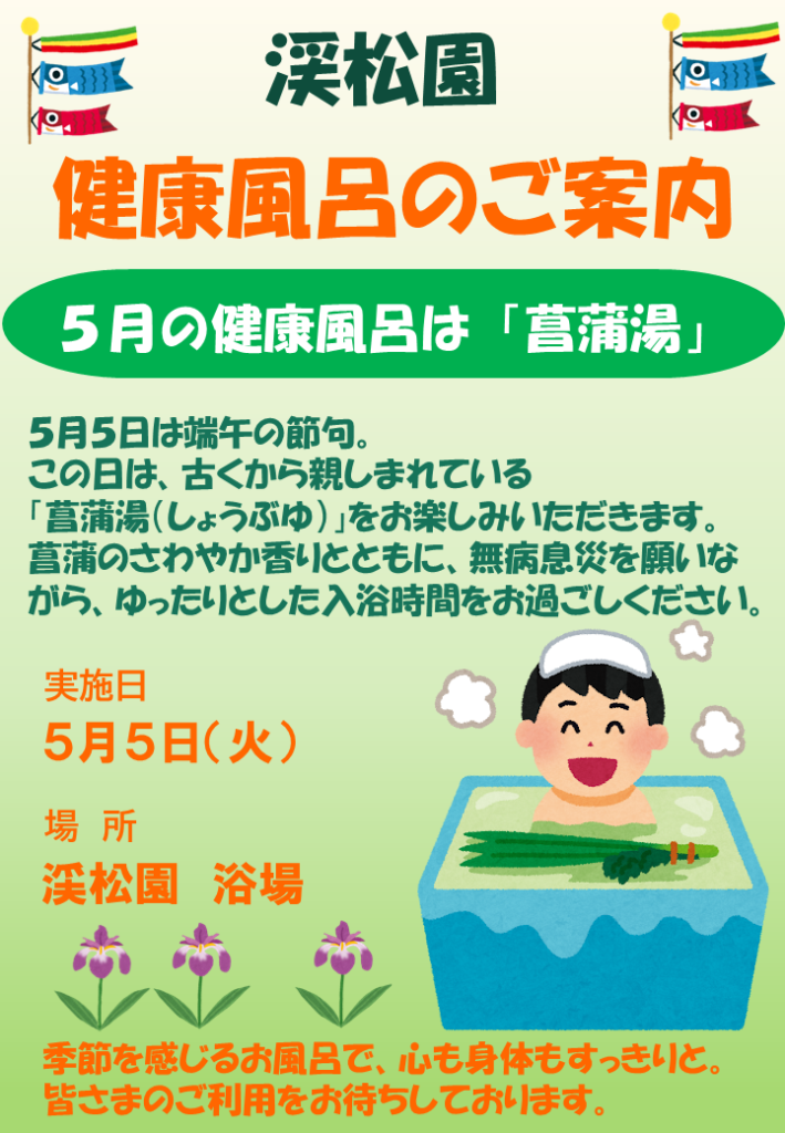 端午の節句は「菖蒲湯(しょうぶゆ)」で、ゆったりとしたひとときをお楽しみください。 皆さまのご利用をお待ちしています。 お風呂の利用(無料)は、当日受付窓口で手続きをお願いします。
